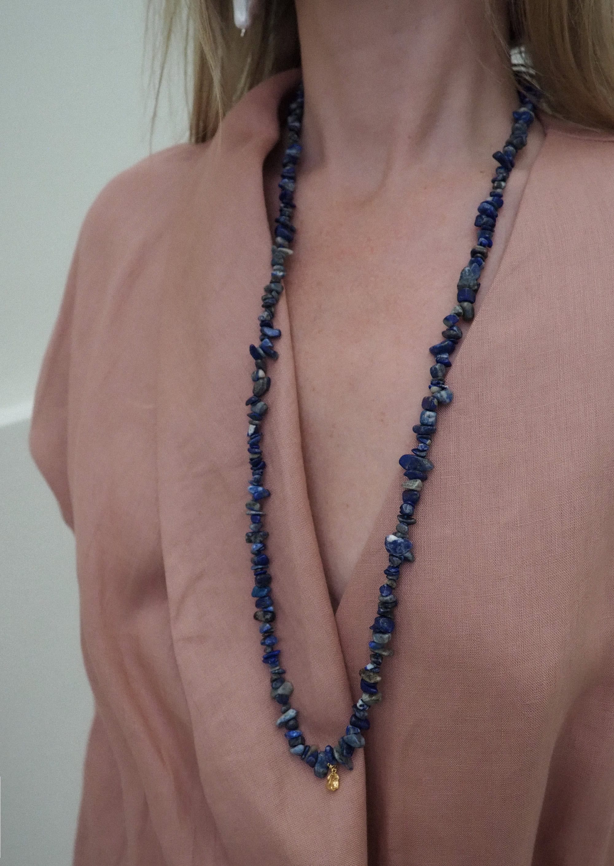 A dreamy blue necklace comprised of semi-precious chips, adorned with a gold element.
