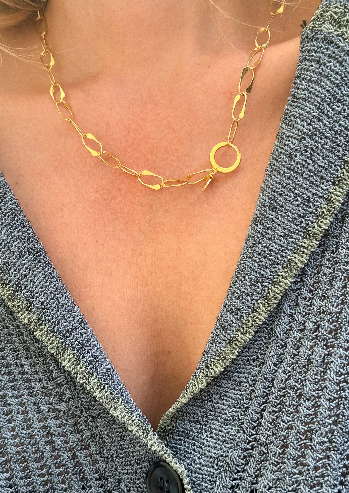 A wide oval hoop chain that can be fastened to any link, offering multiple styling options.