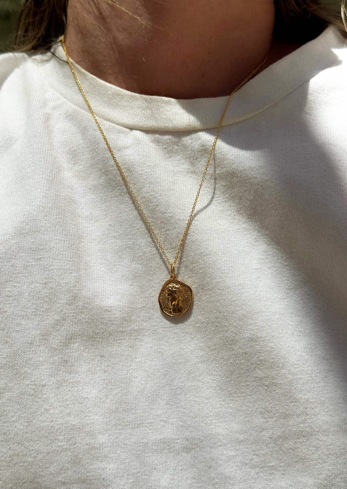 A classic thin chain necklace adorned with a coin charm, depicting Hermis, the clever and curious ancient Greek God of communication, travel, and trade.