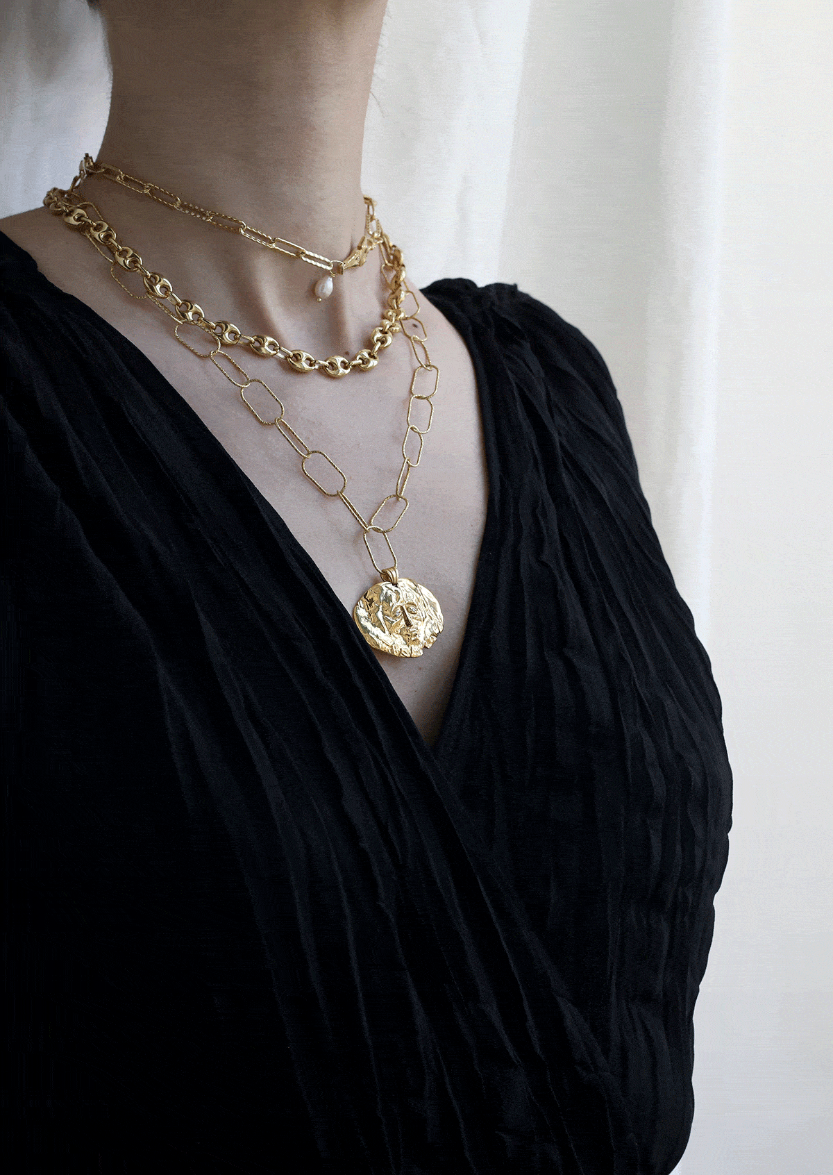 A contemporary chain with links reminiscent of the Greek letter Θ (theta). The chain can be fastened to any link, offering multiple styling options.
