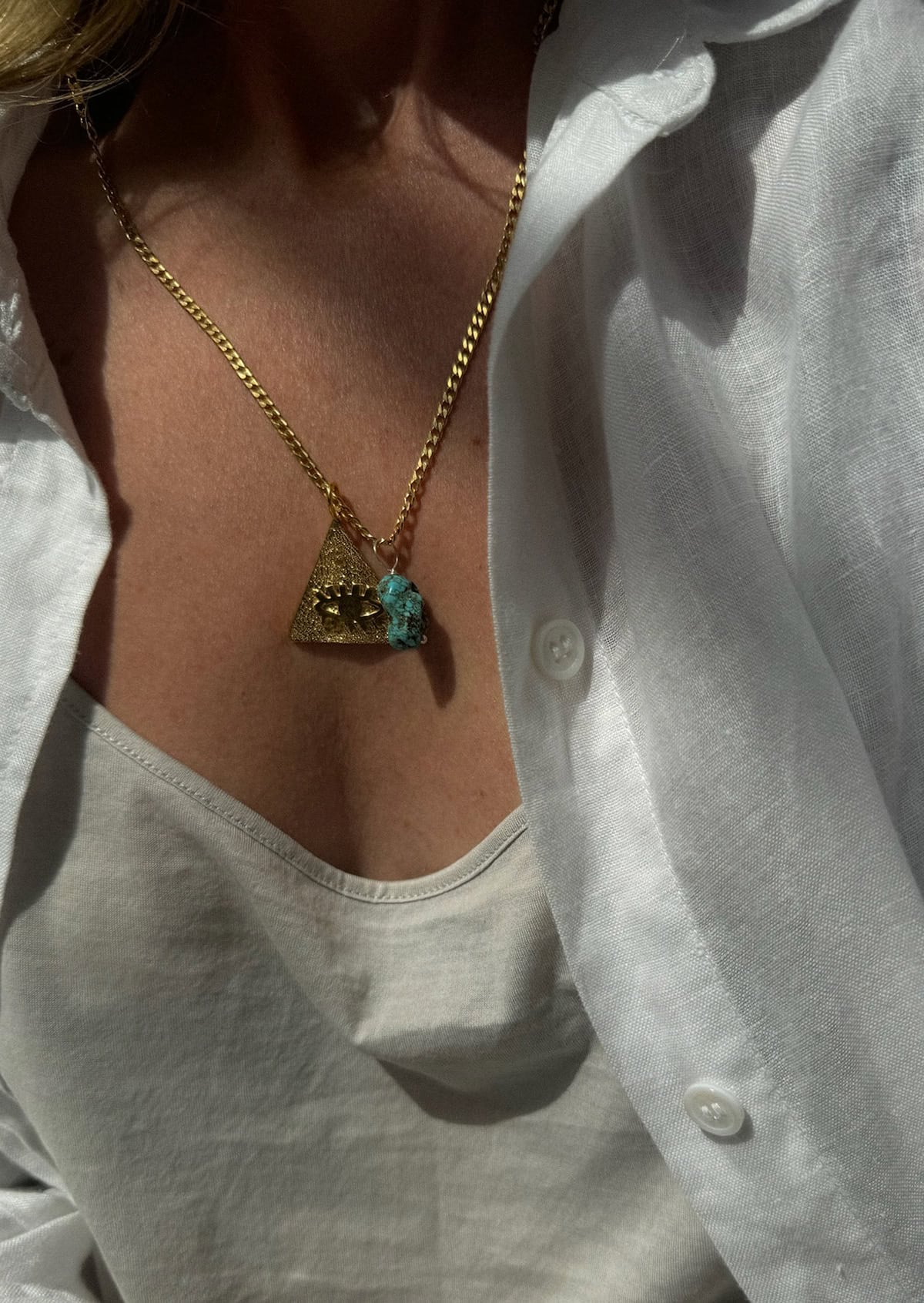 The signature Kressida Pyramis charm hanging from a versatile chain. An all-weather piece, and the perfect base for layering.