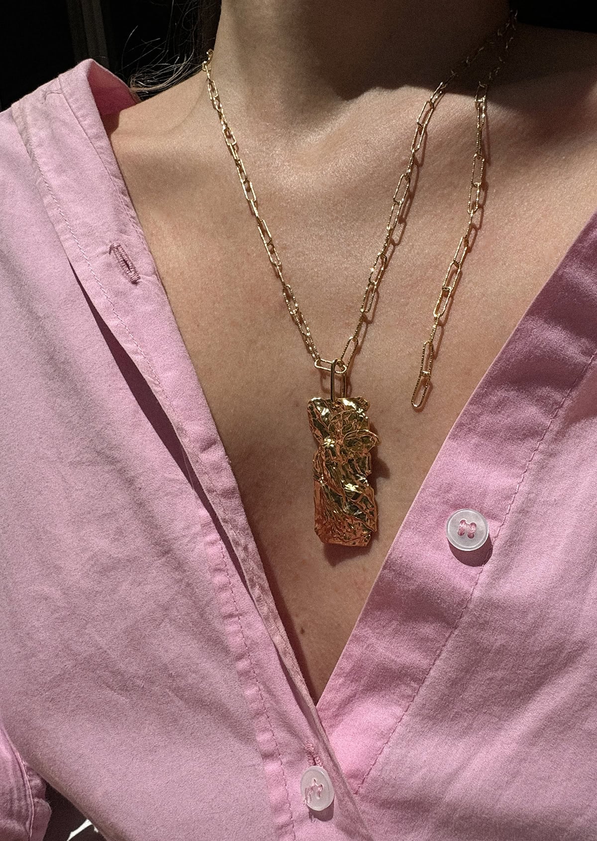 An elegant, narrow link paperclip chain necklace adorned with a large foil charm depicting the angel-like figure of the Greek goddess of Victory, Nike, in sterling silver or dipped in a delicious layer of gold. The chain can be fastened to any link, offering various styling options.