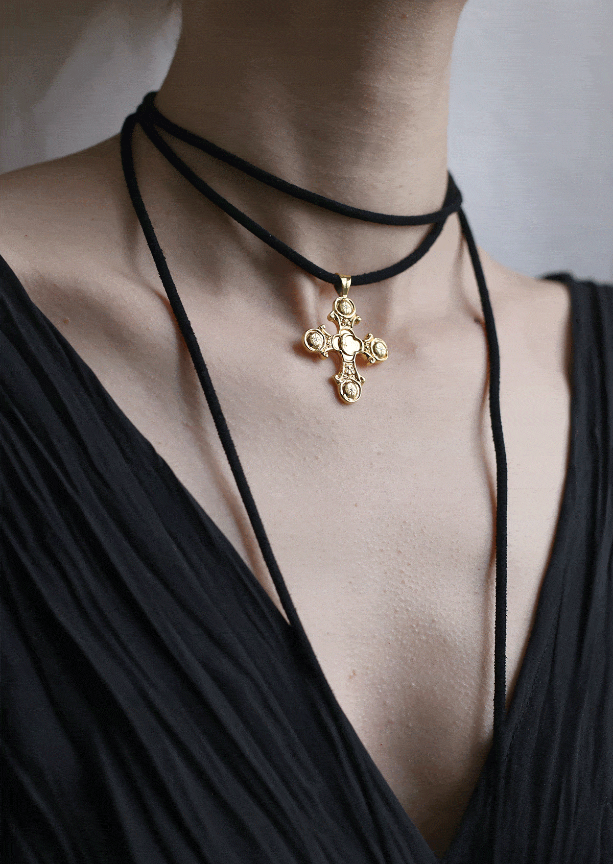 Modern day baroque meets fine jewelry staple in this contemporary cross charm.