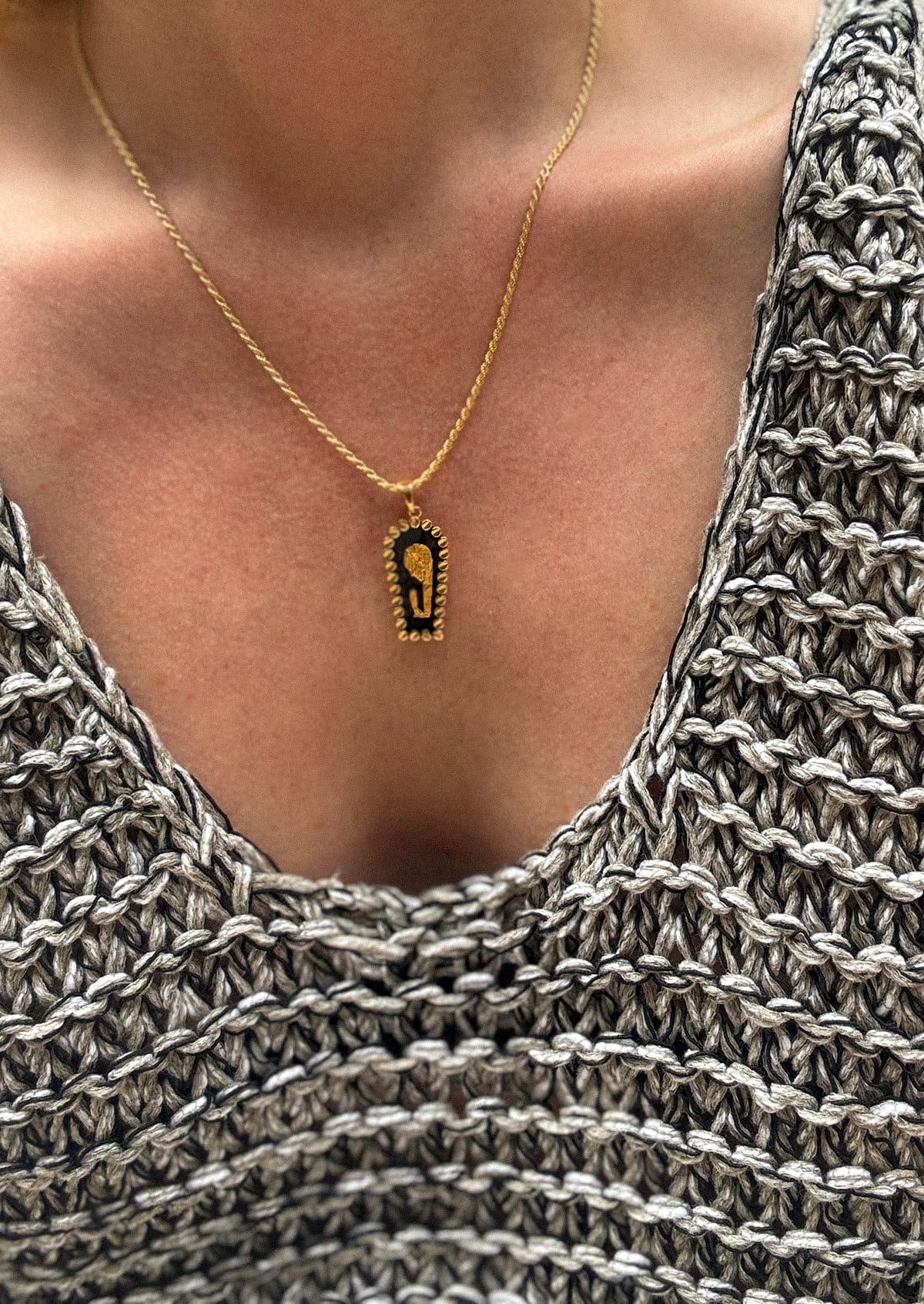 An enamel black charm hanging from a rope chain. The charm depicts a praying lady, adding an element of spirituality.