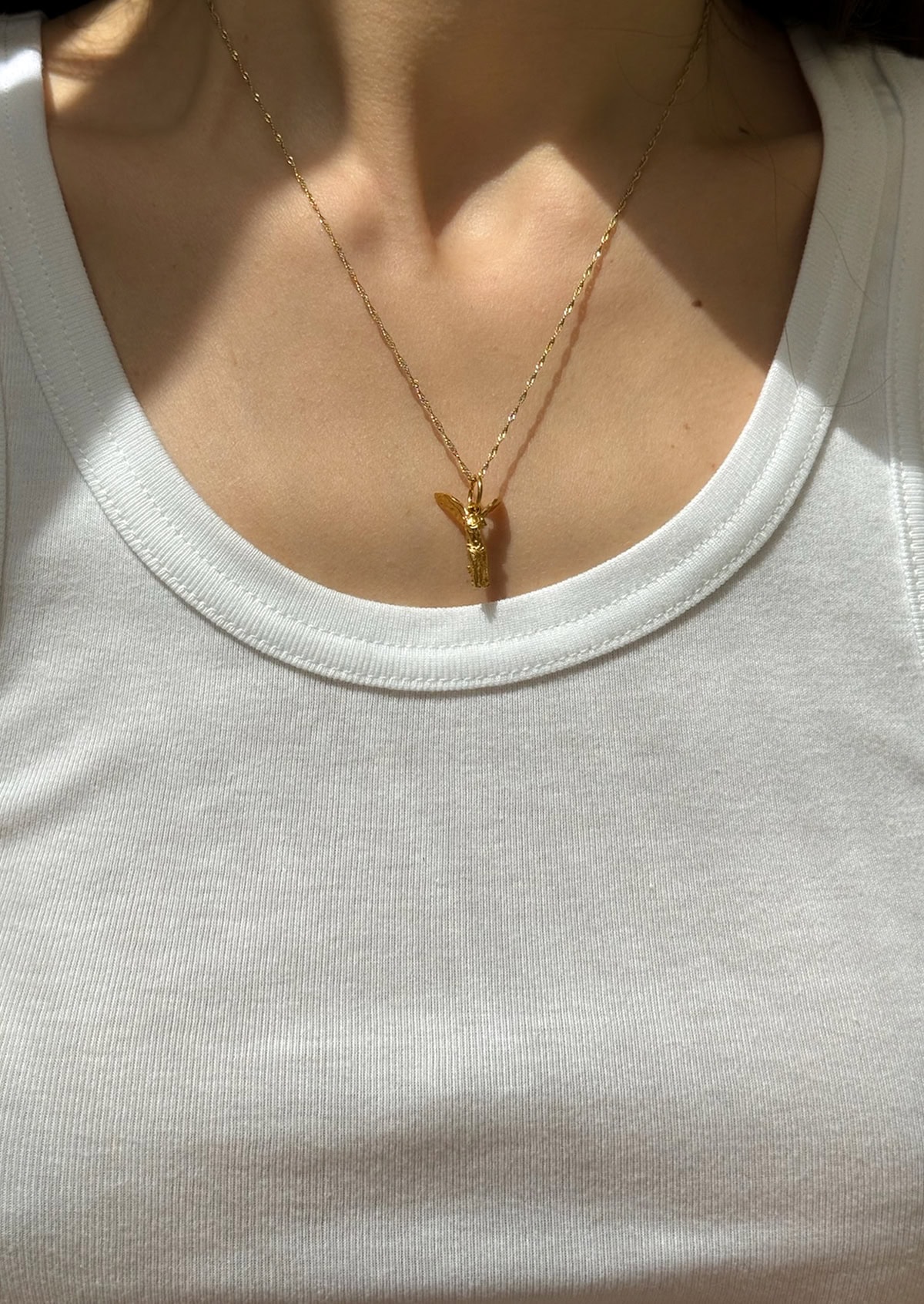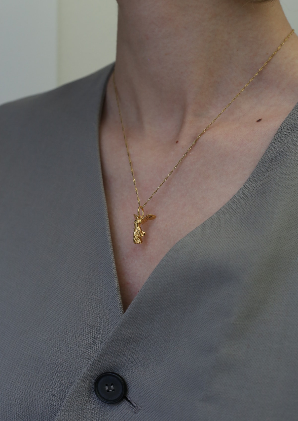 An angel-like figure of the Greek goddess of Victory, Nike, paired with a twisted chain necklace. Subtle yet elegant, the chain allows the charm to shine. The perfect layering piece.