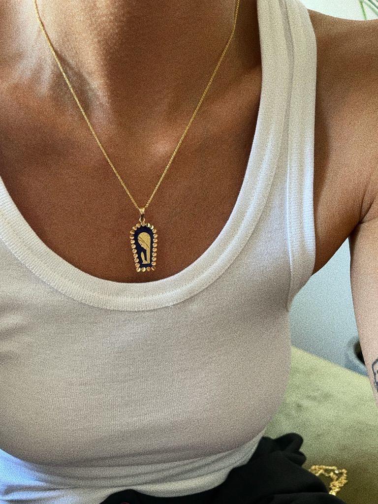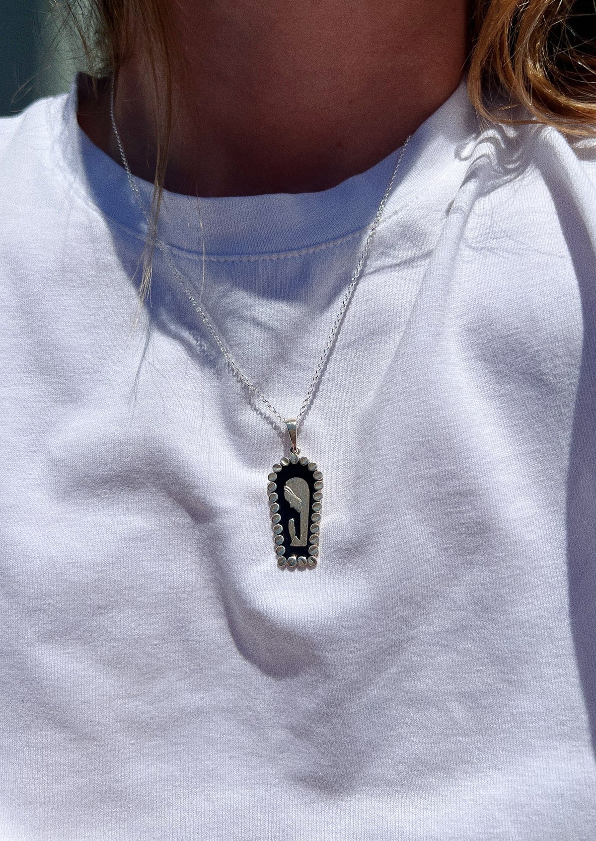 A praying woman made of silver and enamel hanging from our classic thin chain. Stylish and subtle, this is the perfect piece for layering.