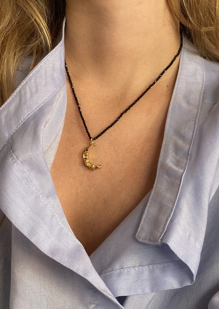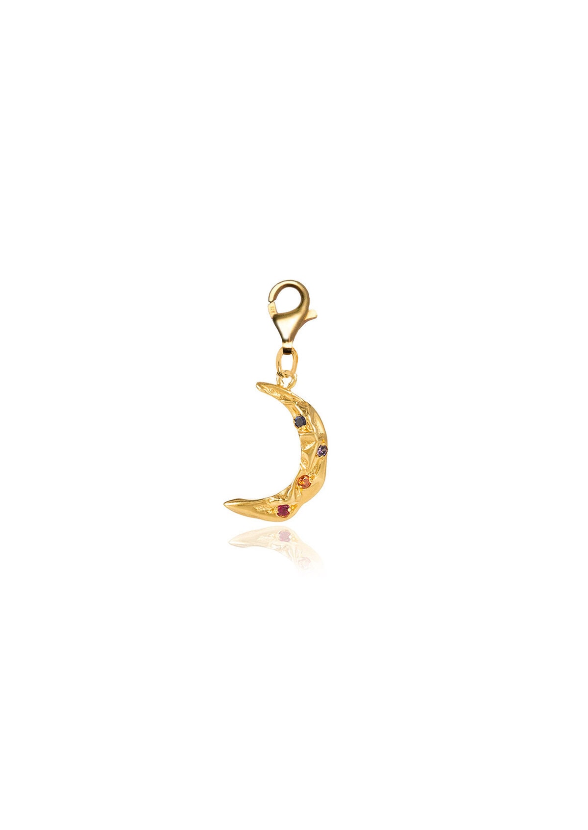 Wrinkled moons and colorful stars inspired by George Méliès who was a French illusionist and director of films involving strange and surreal journeys. A shapely 925 silver gold-plated small moon with colorful zirconia gemstones that you can match with any of our thin chains.
