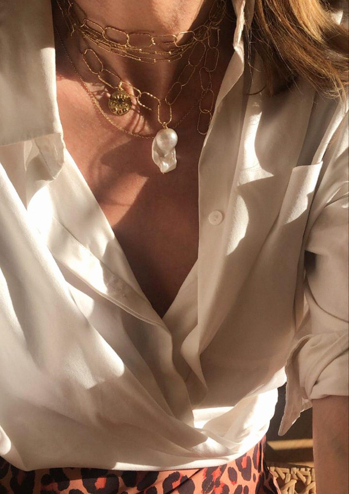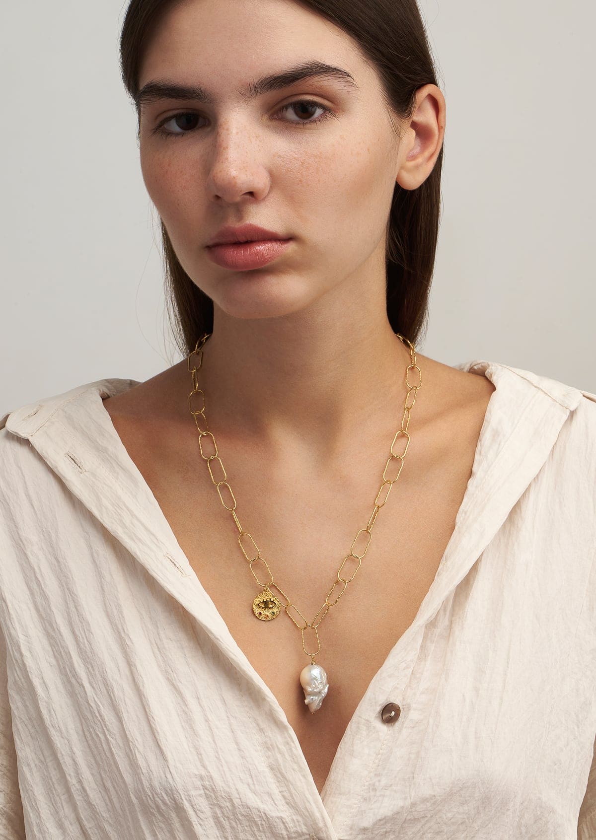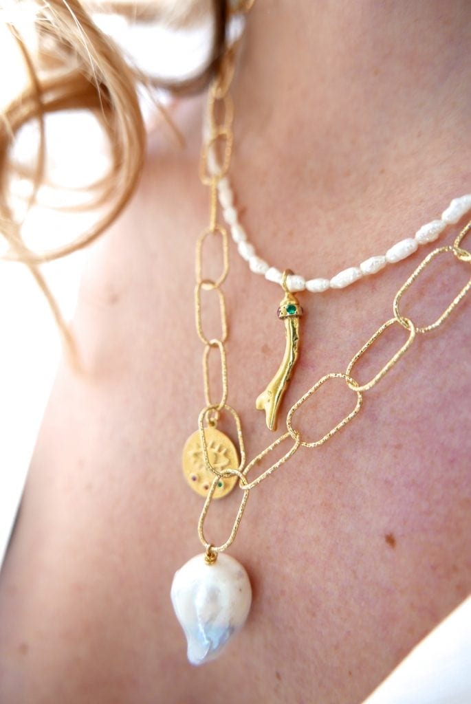 An essential piece in your jewelry box. An elegant chain adorned with the classic Greek eye charm and freshwater pearls. The eye charm of the Kressida medallion is meant to serve as a talisman promoting good energy. Versatile and easy to style, this piece is perfect for layering and playing around with other Hermina jewelry.