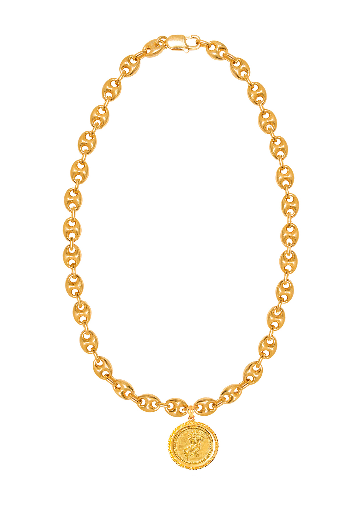 A contemporary chain necklace with wide links reminiscent of the Greek letter Θ (theta), adorned with a charm, inspired from ancient Greek mythology, depicting the horn of Amalthea. Amalthea was the goat that nurtured infant Zeus during the years he was growing up hidden from his father Cronus. One day, as Amalthea played with little Zeus, he accidentally broke off her horn. To make up for it Zeus made the broken horn always be full of whatever its owner desired.