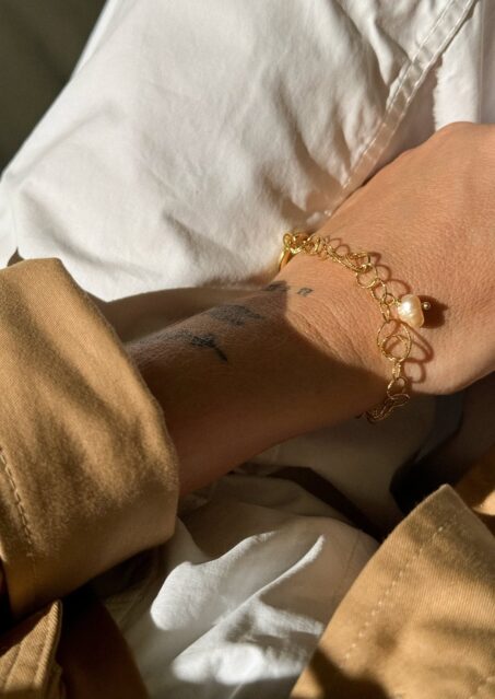 A delicate, lace-like, diamond-cut chain necklace combined with two strings of irregular pearls, with a larger link acting as a pendant, adorned with a charm inspired by the Cycladic idols, the most evocative objects from Greek prehistory. The piece can be fastened to any link, offering various styling options. A sexy touch-up for both your everyday looks and formal attire.